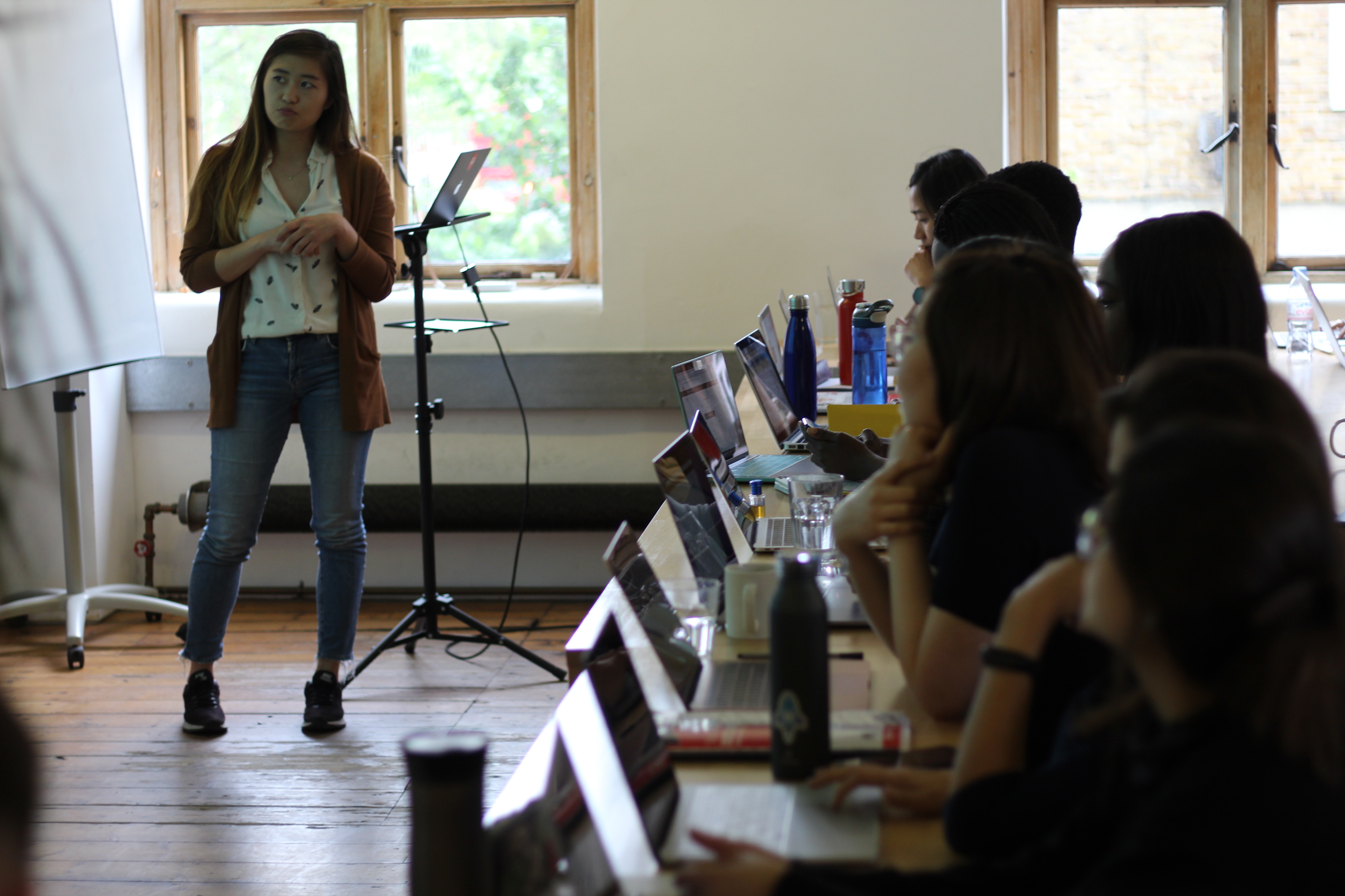 The number one thing that I enjoyed in my previous career was problem solving and I wanted more of that. When I talked to a couple of software engineer friends, the most important element of their jobs was problem solving. I researched and compared bootcamp options and I found Le Wagon's syllabus the most suitable for my level and needs. Heidi pitching her idea to the cohort
