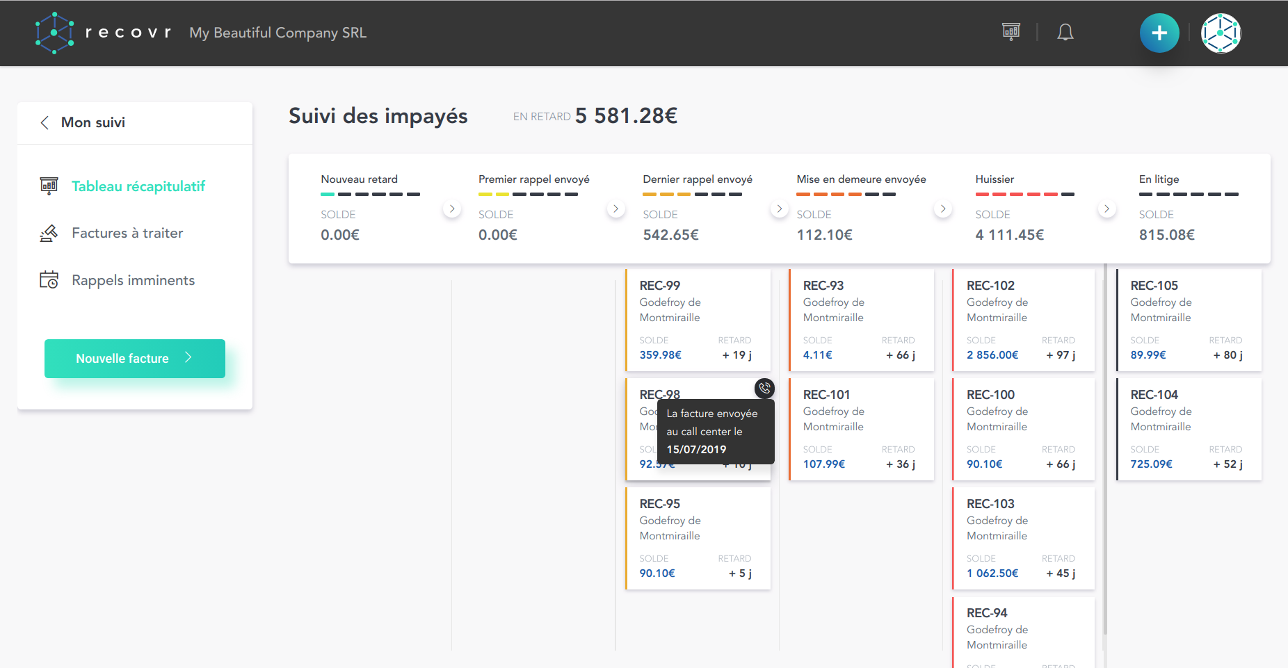 Our job is to help SMEs stop worrying about unpaid invoices. Late and unpaid invoices are the main cause of ⅓ of the bankruptcies in Europe. With Recovr we relieve this burden from companies by automating the whole credit management process, from automatic payment matching, down to the legal procedures with lawyers. Our client is paid faster, with fewer efforts and they can, therefore, focus on their core business. Recovr Fintech App