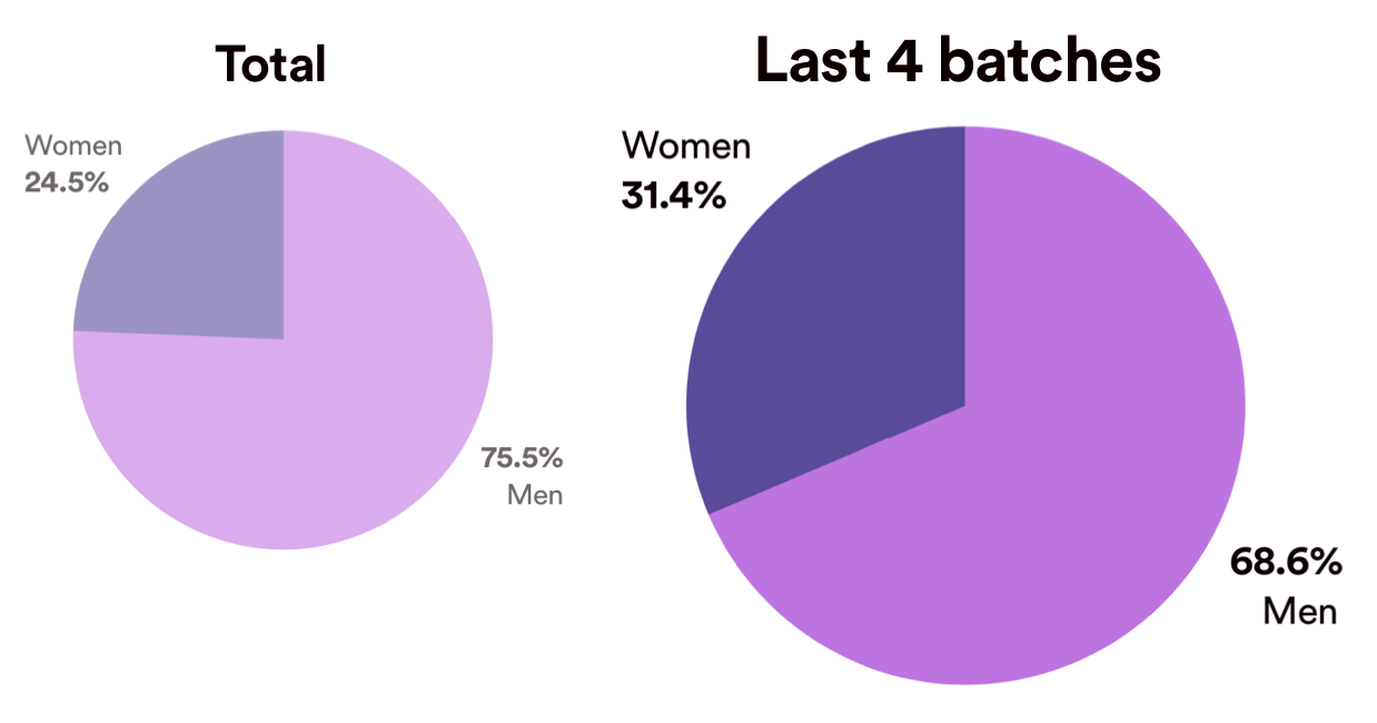 - Second, we’ve been noticing an increase over the past year: our last 4 batches combined had over 30% women enrolled, and this number seems to be improving with each new intake.